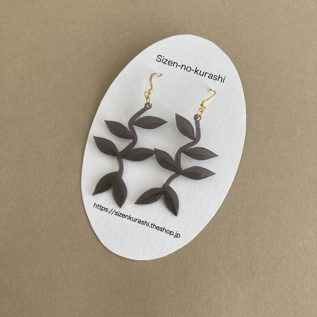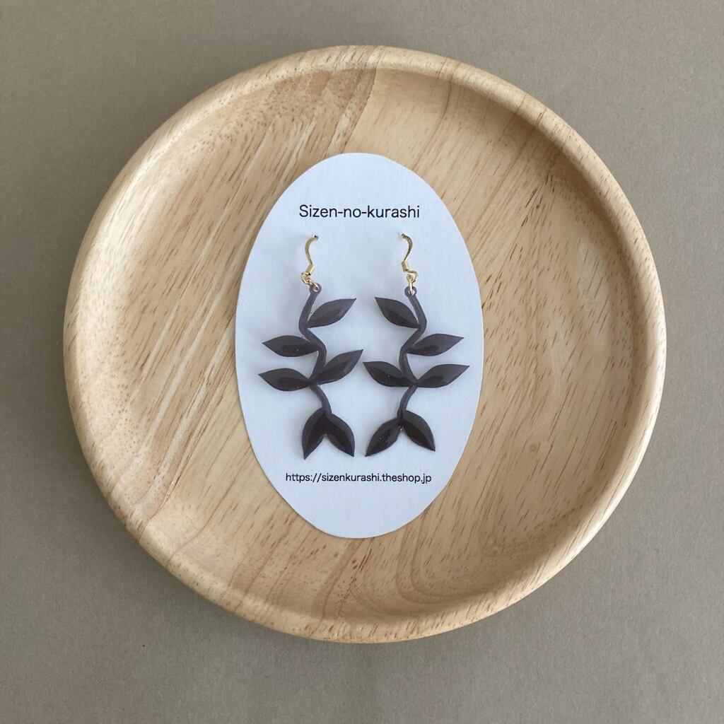ナチュラルな北欧デザインを意識したツル植物を表現したダークグレーカラーの揺れるタイプのピアス・イヤリングです。自然をモチーフにしたシンプルながらも洗練されたデザインは日常のカジュアルコーディネートにも、特別なシーンでもポイントやアクセントになる大人可愛いアクセサリーです。軽くてつけやすいので季節を問わずご愛用いただけるアイテムです。ちょっとしたプレゼントにもオススメです。