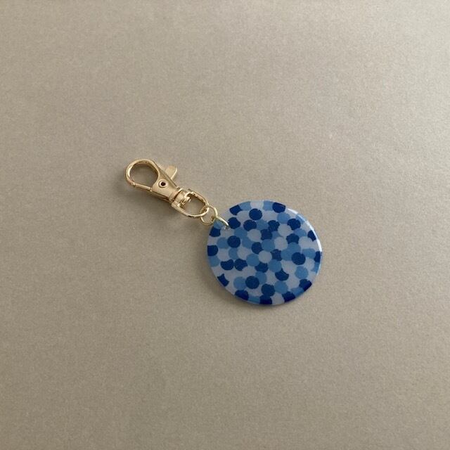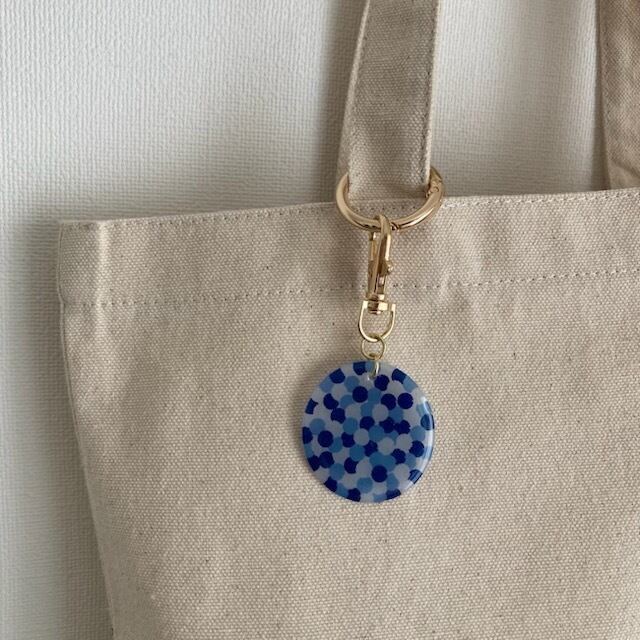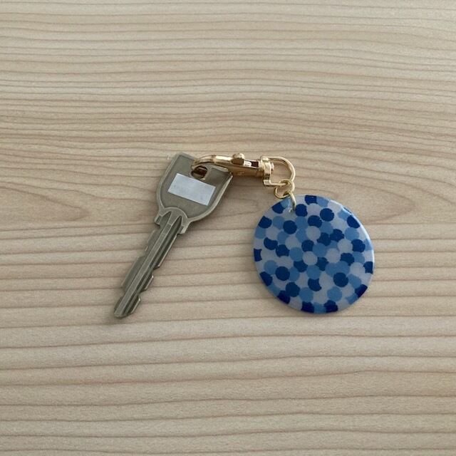 ナチュラルな北欧デザインを意識したシンプルデザインはホワイト、ライトブルー、ブルーの3色のドットを集合させました。日常にも、特別なシーンでもポイントやアクセントになるキーリングです。軽くてつけやすいので季節を問わずご愛用いただけるアイテムです。ちょっとしたプレゼントにもオススメです。カラビナを使えばトートバッグなどの持ち手にもつけられます。