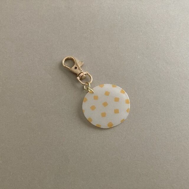 ナチュラルな北欧デザインを意識したシンプルな明るいオレンジ色の四角いドットデザインは日常にも、特別なシーンでもポイントやアクセントになるキーリングです。軽くてつけやすいので季節を問わずご愛用いただけるアイテムです。ちょっとしたプレゼントにもオススメです。カラビナを使えばトートバッグなどの持ち手にもつけられます。